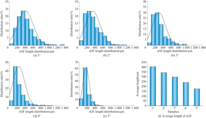 #The length of sGF in the sample is mainly distributed between 100 to 400 μm.#The length of sGF in the samples is mainly distributed between 100~300 μm.#The length of sGF in the sample is mainly distributed between 100 to 200 μm. As can be seen from Figure 2f, 1#~5#The average length of the samples decreased from 405.0 μm to 175.7 μm. This is because the sGF receives a longer screw shear distance when fed from the main inlet, and the presence of unplasticized PA6 particles at the main feeding port synergizes with the screw to exert stronger shear forces on the sGF. In contrast, when the sGF is fed from the side at the fifth barrel section, the screw shear distance is relatively shorter, and the already molten and plasticized PA6 resin provides some protective effect on the sGF. Therefore, the shear effect on the sGF is much greater when fed from the main inlet compared to side feeding, resulting in a gradual decrease in the average length of the sGF as the main feeding amount increases.
