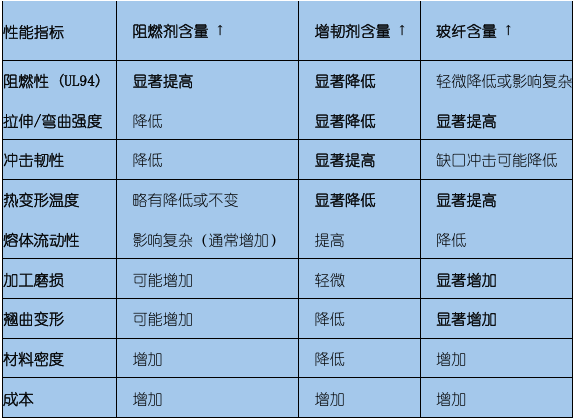 →Strategy:Low glass fiber (~10-15%) + high-efficiency flame retardant (may require >20%) + minimal toughening agent