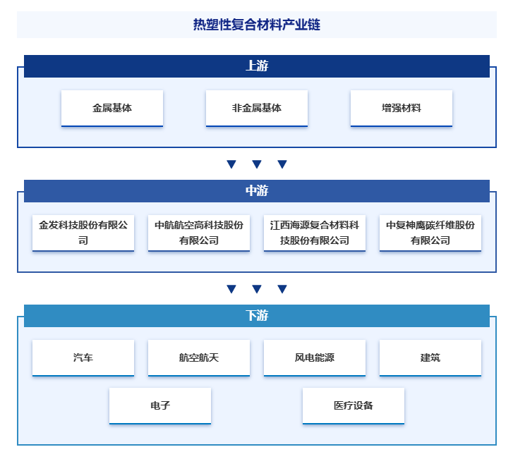 The thermoplastic composite materials industry in China has formed a complete industrial chain system. The upstream of the industrial chain includes metallic matrices (such as aluminum, magnesium alloys, etc.), non-metallic matrices (such as synthetic resins, rubber, etc.), and reinforcement materials (such as fiberglass, carbon fiber, etc.), which provide the basic raw materials for production; the midstream is centered around composite material manufacturers, which process thermoplastic polymers and reinforcement materials to produce semi-finished products like sheets and pipes; the downstream covers application fields such as aerospace, automotive, construction, wind power, electronics, and medical devices, where component manufacturers process semi-finished products into specific parts, and final product manufacturers assemble them into terminal products like aircraft, automobiles, and building components, forming a complete industrial synergy chain. The industrial chain of the thermoplastic composite materials industry is shown in the figure below: