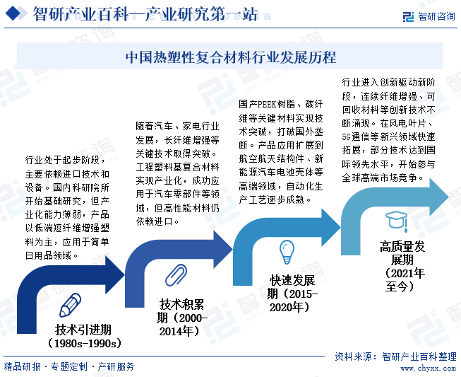 The thermoplastic composite materials industry in China began in the late 1980s. In its early stages, domestic research progressed relatively slowly, with high-performance thermoplastic composites remaining in experimental, small-scale trials and initial application explorations. Industrialization technology was not yet mature, and key raw materials and production equipment were heavily reliant on imports. Between 2000 and 2010, the industry entered a period of technological accumulation, achieving breakthroughs in key technologies such as long-fiber reinforced materials. After 2015, the industry experienced rapid development, with domestically produced high-performance resins and carbon fiber composites gradually breaking foreign monopolies and achieving large-scale applications in fields such as aerospace and new energy vehicles. Since 2021, the industry has entered a new stage of high-quality development, with continuous innovations in continuous fiber reinforced composites and recyclable materials emerging. These advancements are rapidly expanding into new fields such as wind power and electronics, accelerating the move towards the high-end of the global industrial chain.