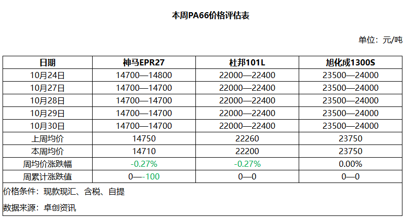 This week, the average price of the domestic PA66 market has declined. As of the close on October 30, the market price of Shenma EPR27 in the East China region was 14,700 yuan/ton in cash, down 50 yuan/ton compared to the closing price last Thursday. The average price this week was 14,710 yuan/ton, down 0.27% compared to last week's average price. Demand is weak, and the market is operating sluggishly.