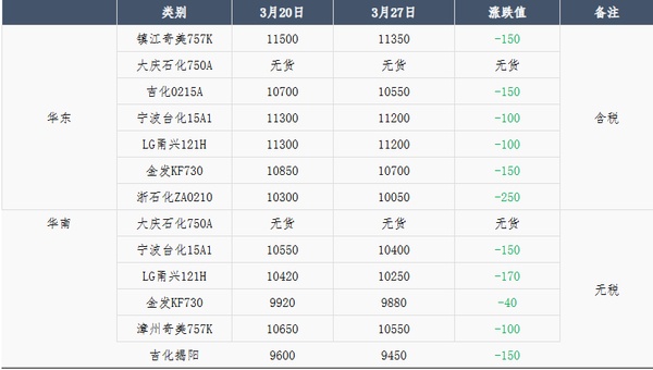 This week's ABS market trend:During this period (March 20-27, 2025), market prices fell across the board, and trading activity was very weak. On Monday, petrochemical plants lowered their ex-factory prices across the board, leading to a drop in market prices, which fell by 100-200 yuan/ton this week. Recently, the ABS industry has seen an increase in production, resulting in a situation of oversupply, and market prices continue to weaken. Negative sentiment is prevalent in the market, with traders offering low prices to clear inventory, leading to an overall bearish market outlook.