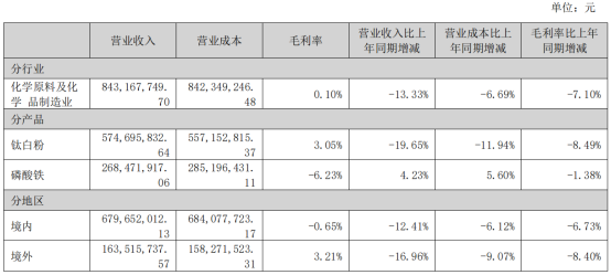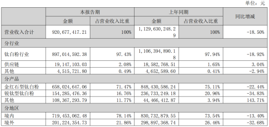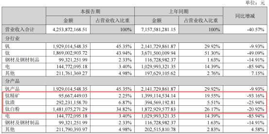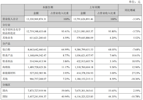 During the reporting period, titanium concentrate revenue was 95,667,449.03 yuan, a year-on-year decrease of 93.16%.Titanium dioxide revenue amounted to 1,481,075,271.29 yuan, down 20.92% year-on-year.
