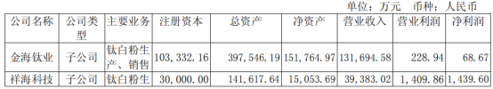 The company's wholly-owned subsidiaries Jinhai Titanium Industry and Xianghai Technology jointly form the company's titanium dioxide business segment. Among them, Jinhai Titanium Industry owns a sulfuric acid process titanium dioxide production line with an annual capacity of over 200,000 tons. During the reporting period, titanium dioxide...The revenue is 1,316.9458 million yuan, and the operating profit is 2.2894 million yuan.Xianghai Technology currently has an annual production capacity of 60,000 tons of chloride process titanium dioxide production lines.Operating income is 393.8302 million yuan, and operating profit is 14.0986 million yuan.