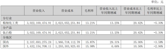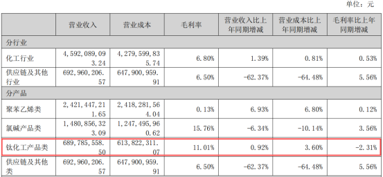 During the reporting period, Tianyuan Co., Ltd.Revenue from titanium chemical products was 689,785,558.50 yuan, an increase of 0.92% year-on-year.The gross profit margin decreased by 2.31%.