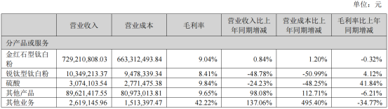 During the reporting period,AnadaTitanium dioxide revenue was 574,695,832.64 yuan, down 19.65% year-on-year.Gross profit margin was 3.05%, a year-on-year decrease of 8.49%.