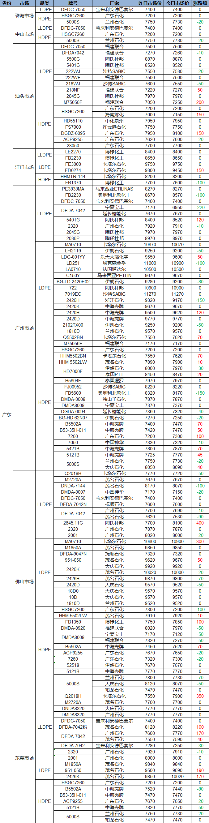 Today PP and PE Prices in Guangdong Show Mixed Trends! PP Prices Fluctuate Between Increase and Decrease of 10-220, PE Sees Highest Increase of 400