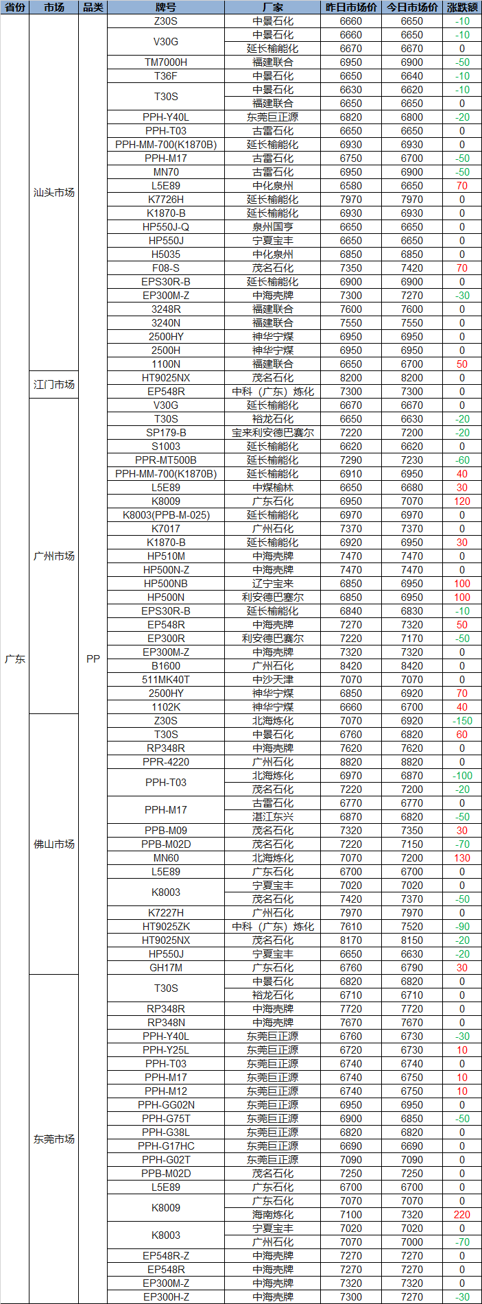 Abstract: On October 21, the Guangdong polyolefin market opened with new prices! PP adjusted partially, with most prices fluctuating up or down by 10-120, the highest drop being 150, and the highest increase being 220; PE showed mixed results, with some prices fluctuating up or down by 10-200, the highest drop being 220, and the highest increase being 400.