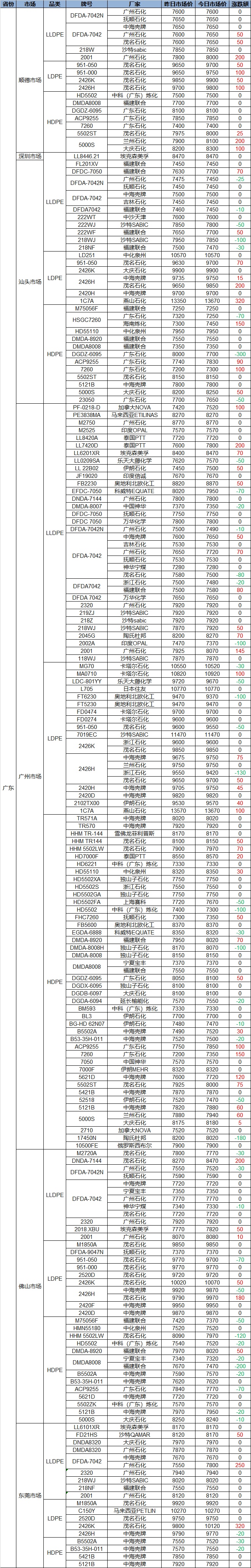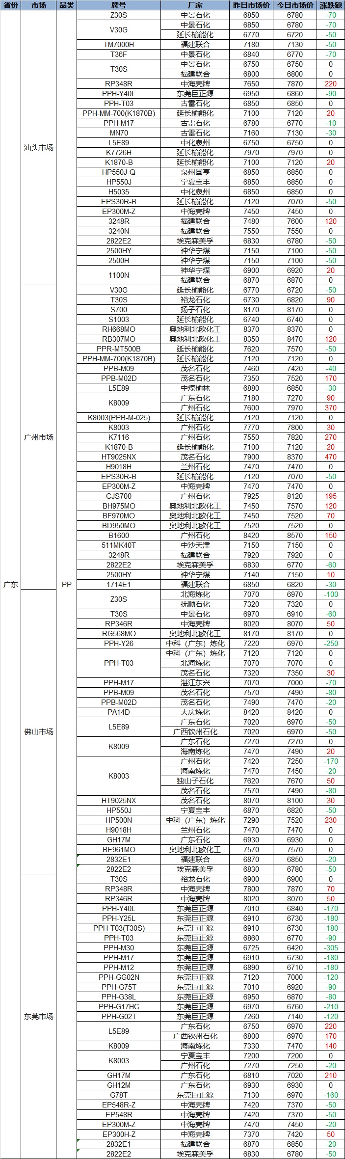 Summary: On October 9th, the Guangdong polyolefin market opened with new prices! PP showed mixed results, with some down by 10-100, while others rose by 20-220, with the highest increase at 470. PE also showed mixed results, with some down by 10-100, while others rose by 5-200, with the highest increase at 320 and the highest decrease at 300. The Shunde market showed overall gains.