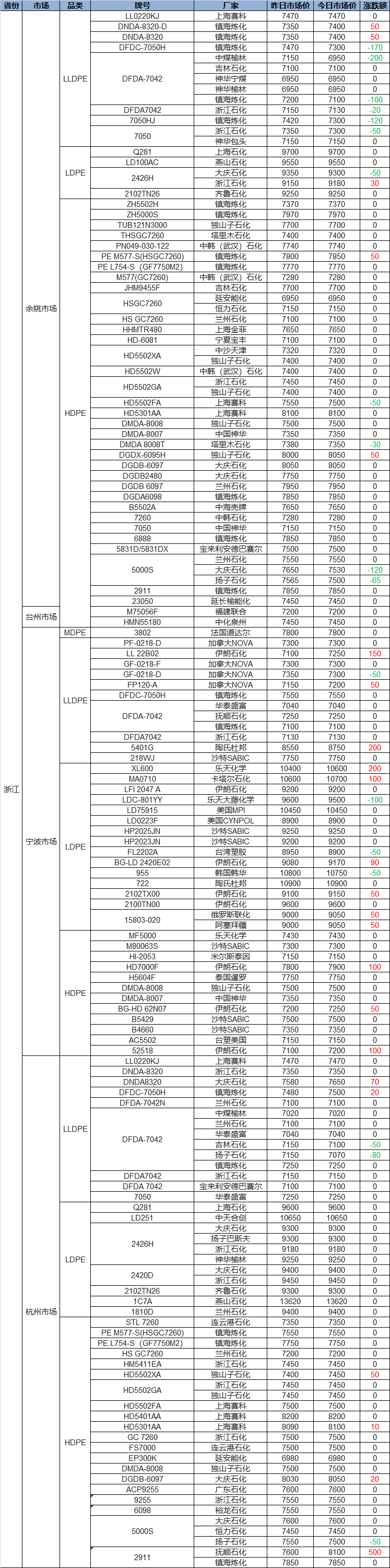 Summary: On October 23, the Zhejiang polyolefin market opened with new prices! PP saw more increases than decreases, with most rising by 30-280, and the highest increase being 300; PE mostly showed gains, with some rising by 30-200, and the highest increase reaching 500, while some decreased by 50-200.
