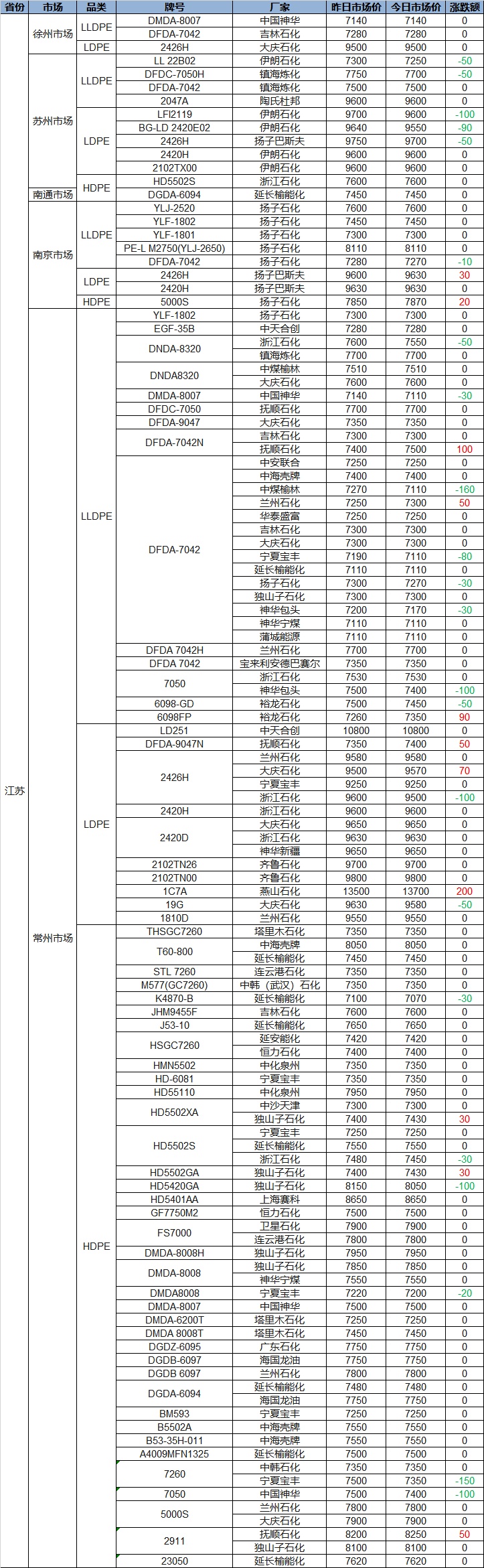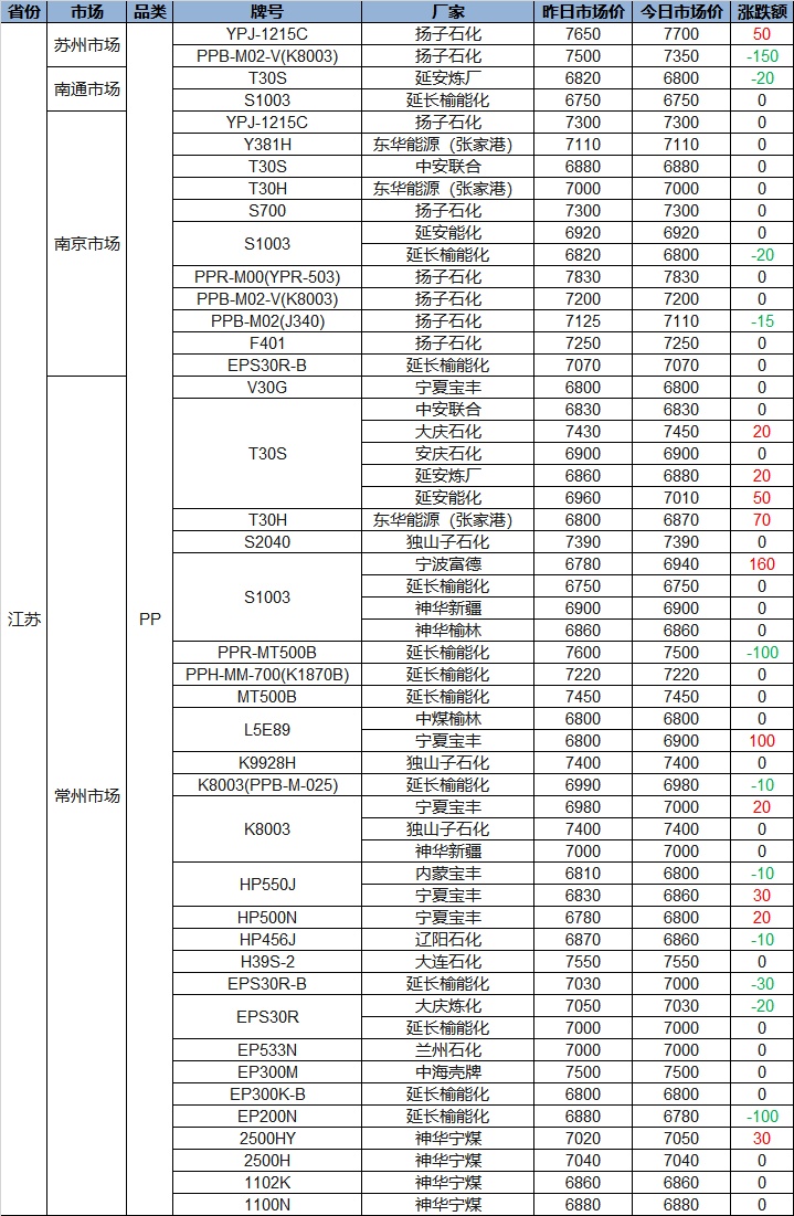 Today PP, PE Jiangsu Plastic Prices Fluctuate Narrowly! PP Rises By 160, PE Rises By 200