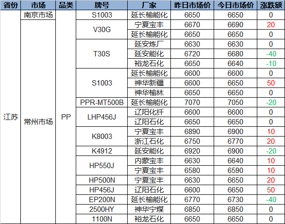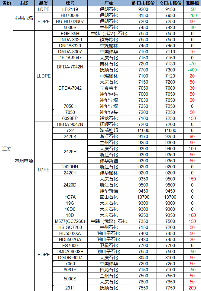 Today PP, PE Jiangsu Plastic Prices Mixed, PP Some Rise and Fall 10-50, PE Highest Drop 400