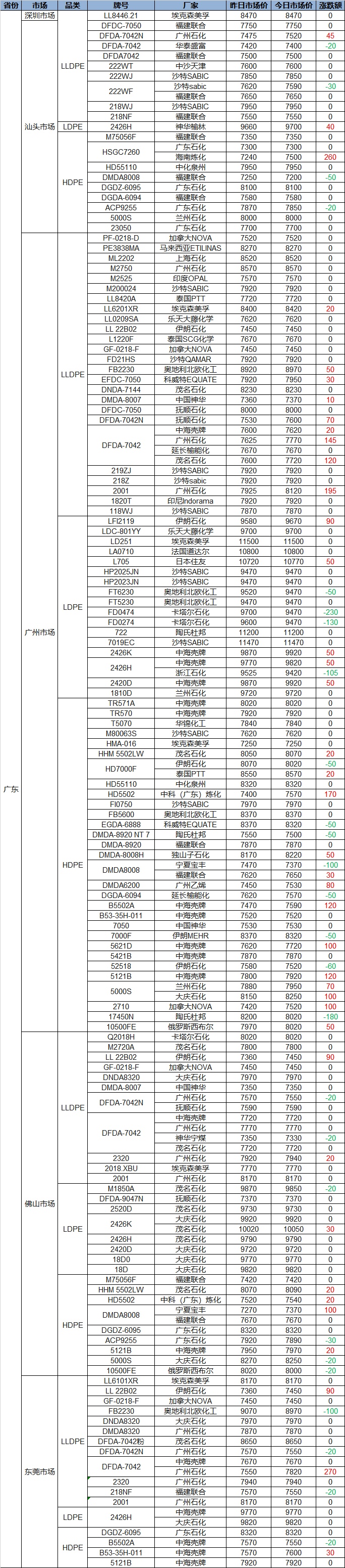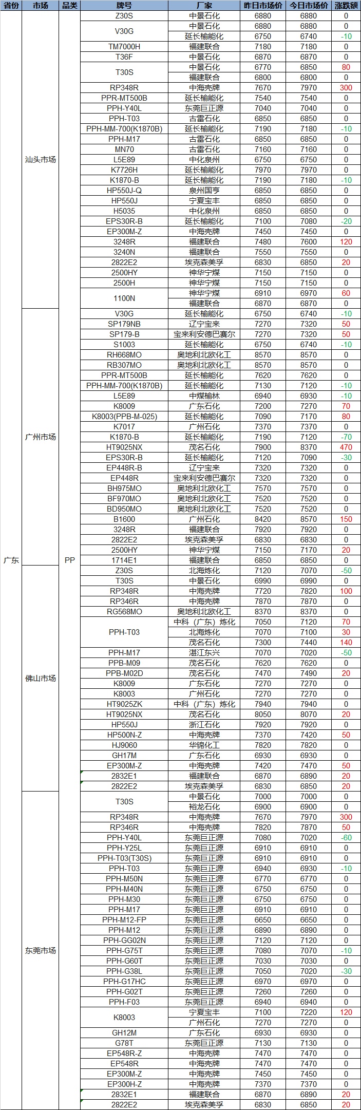 Today PP, PE Prices in Guangdong Show Mixed Trends! PP Sees Increases of 20-150, PE Rises Up to 270