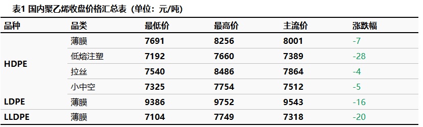 ②. The price change range for the HDPE market is -28 to -4 yuan/ton, the LDPE market price is -16 yuan/ton, and the LLDPE market price is -20 yuan/ton.