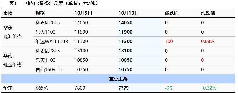 Today, the domestic PC market operated within a narrow range at high levels. By the afternoon close, mainstream negotiation references for low-end injection molding grades in East China ranged from 10,400 to 13,400 yuan/ton, while mid-to-high-end grades were discussed at 14,050 to 14,800 yuan/ton. Overall, the market focus remained stable, with specific domestic products in short supply continuing to support an upward momentum. After the holiday, domestic PC factories maintained firm pricing operations, with a certain PC factory in Henan raising prices by 200 yuan/ton. In the spot market, both East and South China remained stable with a wait-and-see approach. Although the market has seen significant increases recently, there has been no improvement in downstream follow-up. However, considering that supply support remains, operators maintain a cautious and moderate mindset, with quotations temporarily stable and transactions moving along with the market. The atmosphere for transactions was quiet during the day.