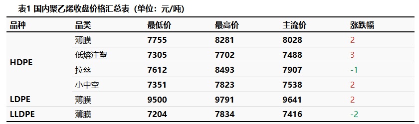 The macroeconomic support has strengthened, but the operating conditions of downstream factories are below expectations, leading to insufficient market confidence. Market quotations have tentatively increased, with transactions mainly occurring at low prices. The price fluctuation range for the HDPE market is -1 to -3 CNY/ton, the LDPE market price is +2 CNY/ton, and the LLDPE market price is -2 CNY/ton.