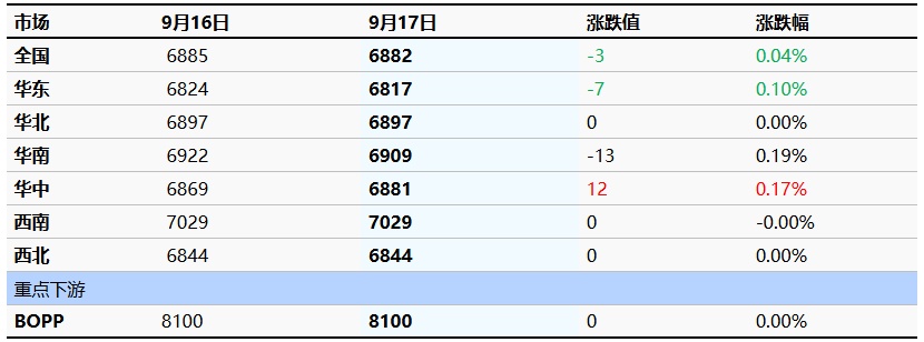 Summary: Summary of the prices and forecasts for general and engineering plastics on September 17.General materialsIn terms of market confidence, it has weakened. PP and PE fluctuated within a narrow range, with some prices rising or falling by 1-12; PS remained mostly stable with minor fluctuations, with individual drops of 30; ABS saw some increases or decreases of 50-70; EVA transactions were sluggish, with some prices dropping by 100; PVC experienced weakness in both supply and demand, with intraday prices remaining weak and stable.Engineering materialsIn this regard, PC fluctuated within a narrow range at a low level, with individual increases of 100. PET, PBT, POM, PMMA, and PA remained flat and stable.