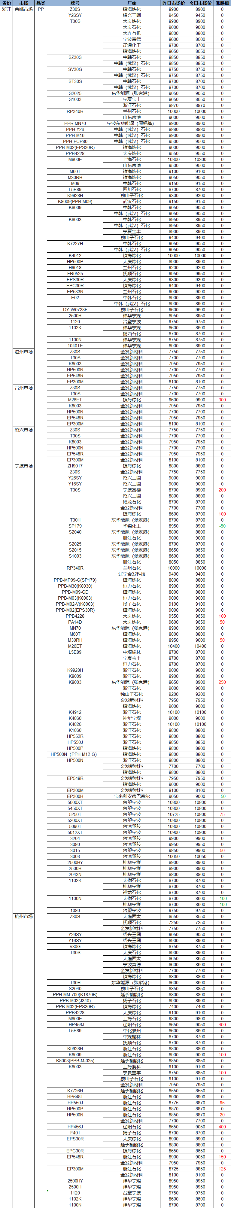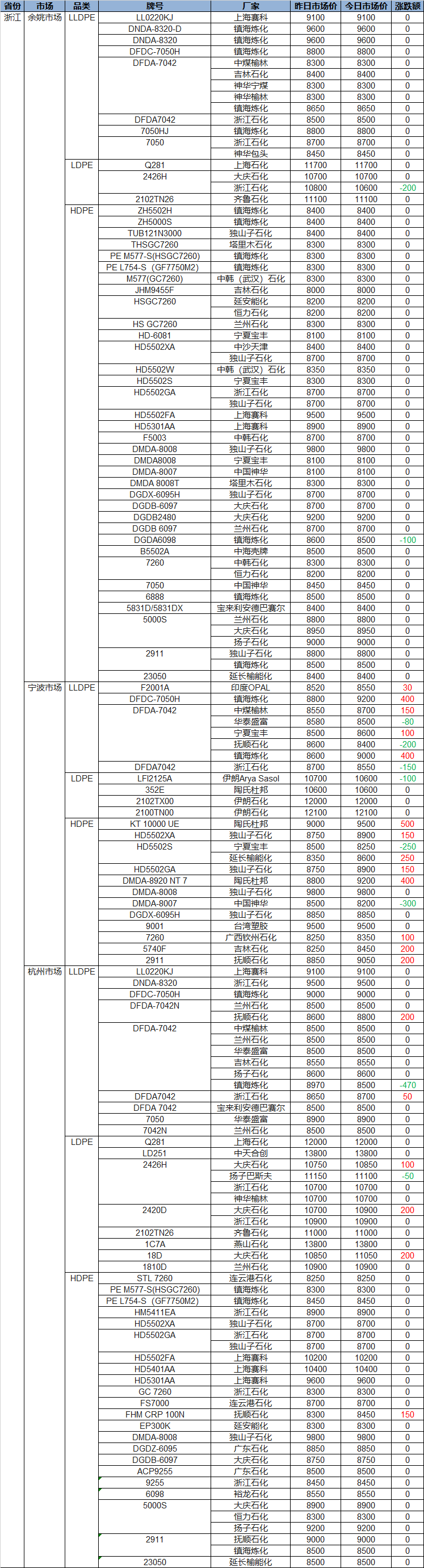 Summary: Zhejiang Polyolefin Market Early Price on March 16! PP fluctuated locally, with some rising or falling by 50-300, the highest increase of 500; PE rose more than fell, with some rising or falling by 50-300, the highest increase of 500, the highest decrease of 470.