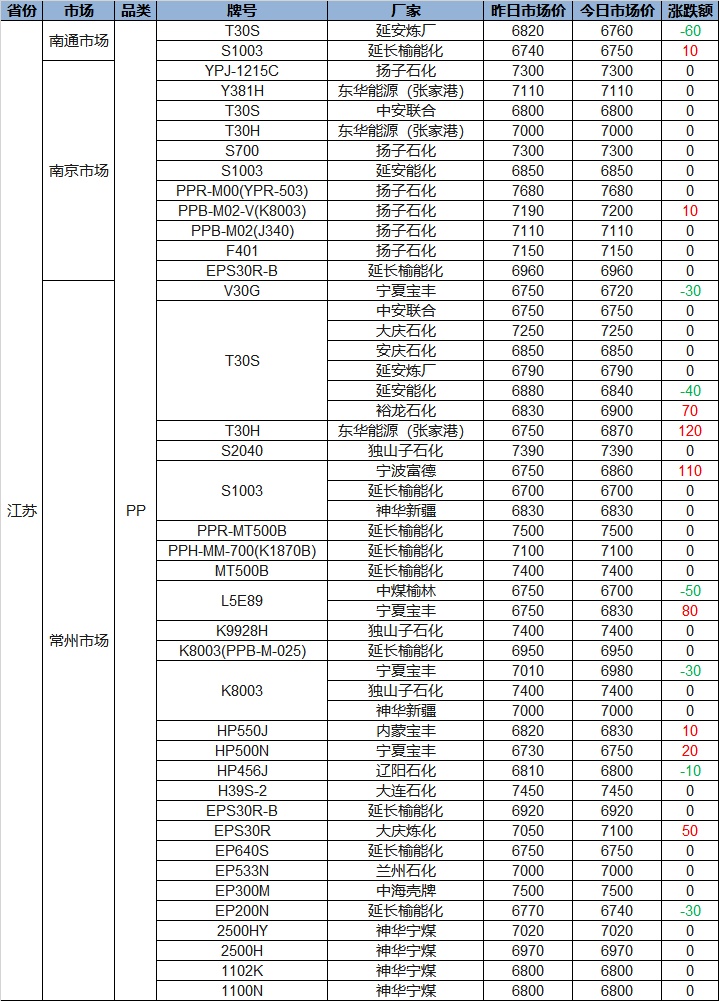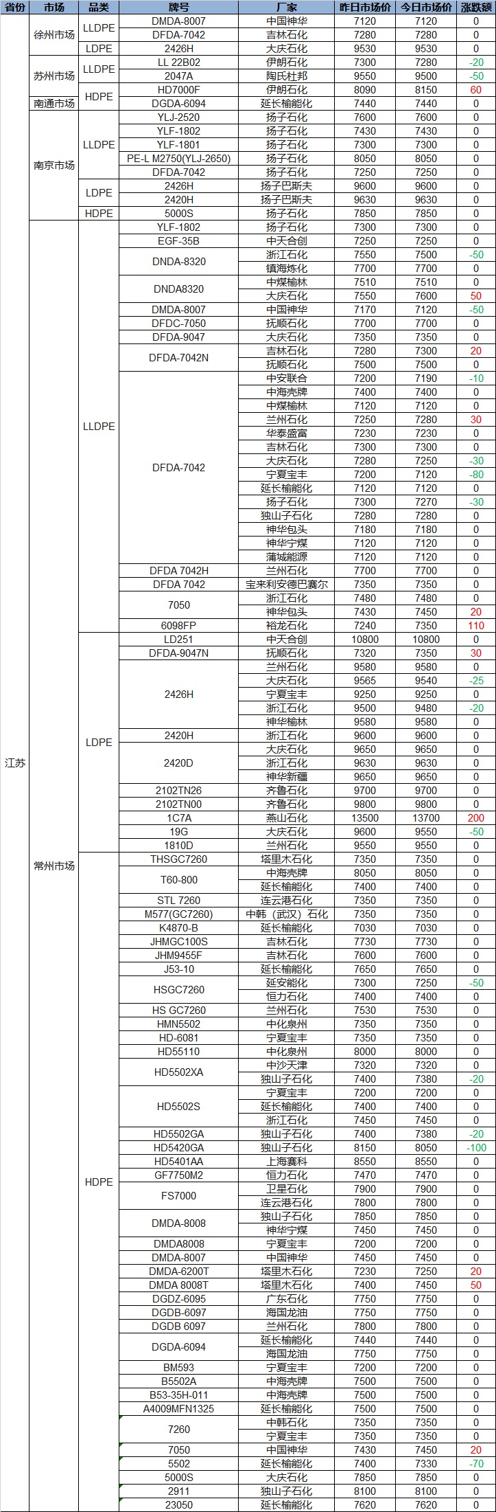 Today’s PP, PE Jiangsu Plastic Prices: PE Sees Local Fluctuations, Changes Mostly Between 20-100! PP Highest Increase of 120