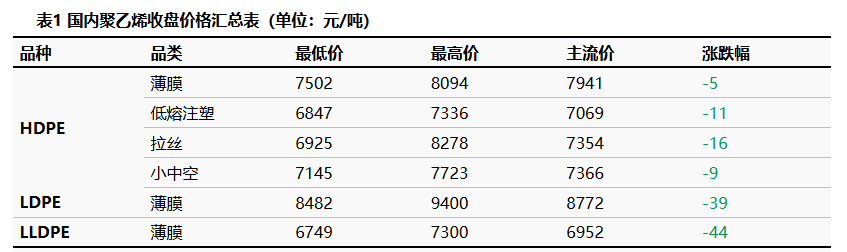 ②. The price change range for the HDPE market is -16 to -5 yuan/ton, the LDPE market price is -39 yuan/ton, and the LLDPE market price is -44 yuan/ton.