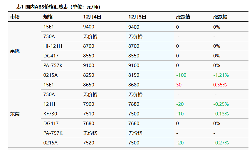 Based on the Ningbo and Dongguan areas, prices in the East China market are declining, while prices in the South China market continue to trend downwards. Today's market transactions were sluggish, with significant sales pressure on petrochemical plants. Traders showed a strong inclination to sell at lower prices, and quotations continued to decline. It is expected that the domestic ABS market will experience a narrow decline next week.