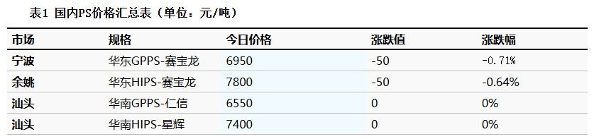 Today, the price of GPPS in East China dropped by 50 to 6,950 yuan/ton.