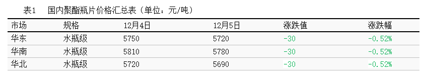 Today, the spot price of polyester bottle-grade PET in the East China region is 5720, a decrease of 30 compared to the previous working day, in line with the morning forecast.
