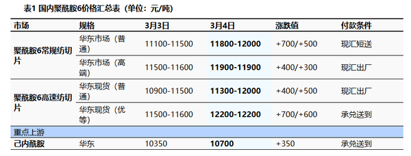 Theprice of pure benzene from Sinopec continues to rise, increasing the cost pressure on polymers, and currently, there is a limited amount of polymer spot goods available for sale, leading to an overall upward trend in the market. It seems there was a slight typo in the translation. The correct translation should be: The listed price of pure benzene from Sinopec continues to rise, increasing the cost pressure on polymers, and currently, there is a limited amount of polymer spot goods available for sale, leading to an overall upward trend in the market. Currently, the East China PA6 conventional spinning grade is priced at RMB 11,800–12,000 per metric ton for cash payment with short-distance delivery; the high-speed spinning grade is priced at RMB 11,300–12,000 per metric ton for delivery with acceptance payment.