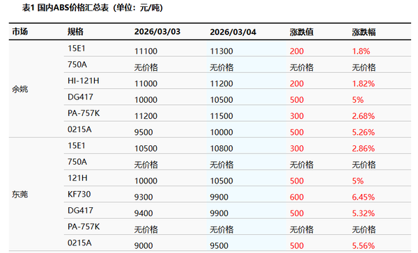 ABS: Factory prices continue to rise; prices increase across the board today.