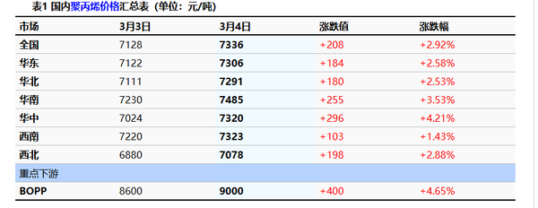 ②、 Sinopec's refining plants in East China, South China, and Central China have raised the price of pure benzene by 200 yuan/ton, effective at 6800 yuan/ton from March 4.
