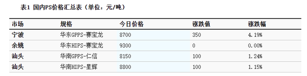 ① Today, the East China GPPS price increased by CNY 350/ton to close at CNY 8,700/ton.