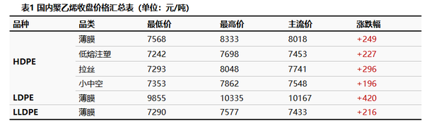 ②、 The HD PE market price fluctuated by 196-296 yuan/ton, the LDPE market price increased by 420 yuan/ton, and the LLDPE market price increased by 216 yuan/ton.