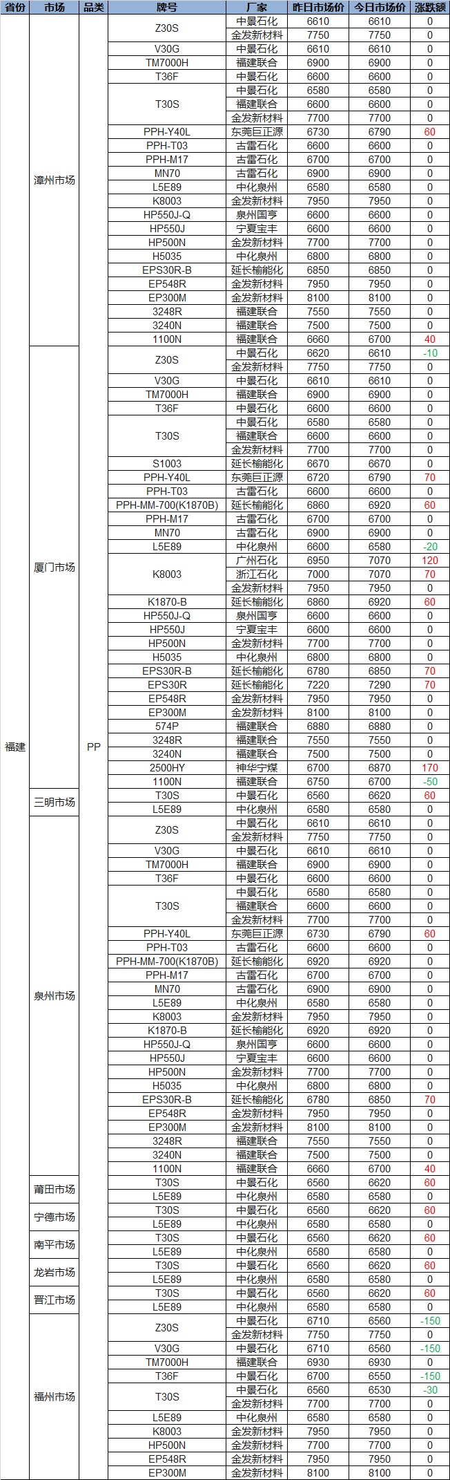 Abstract: On October 17, the Fujian polyolefin market saw new prices in the morning! PP showed some gains, with increases of 40-70 in some areas, the highest increase being 170, while the highest decrease was 150. PE saw more declines than increases, with some drops of 20-100, individual increases of 30-200, and the highest drop being 300.