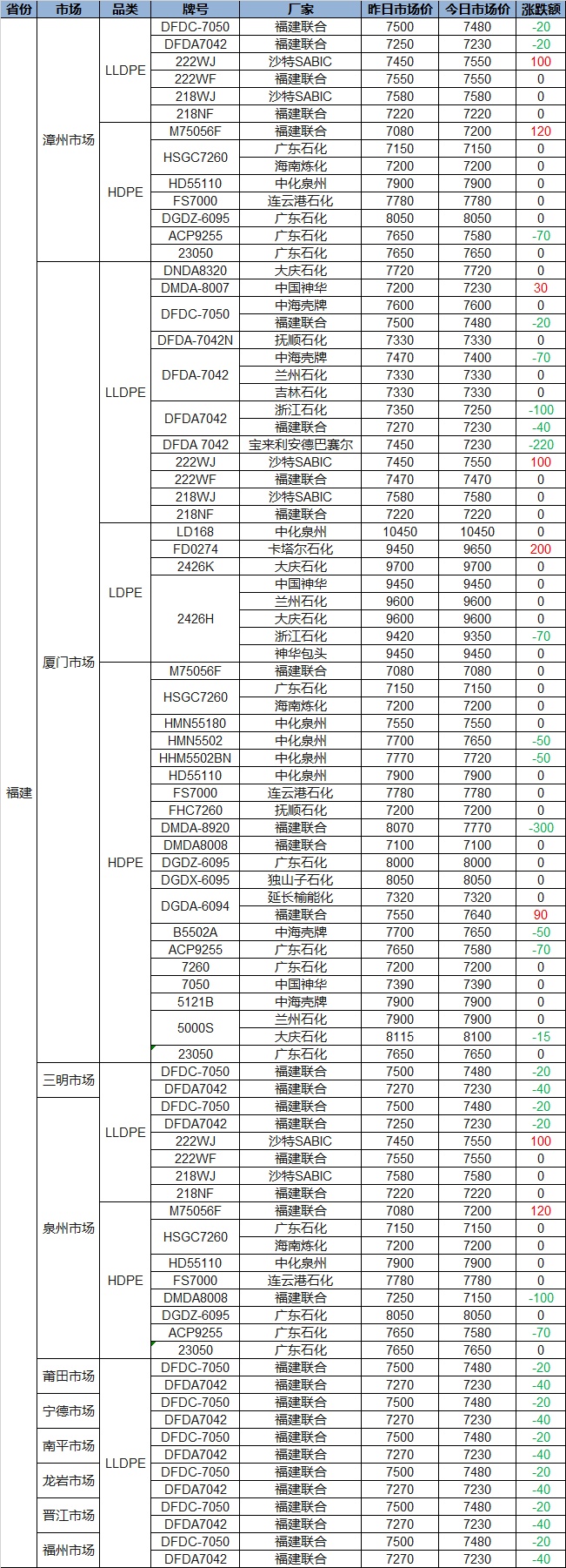 Today's PP and PE Fujian Plastic Prices: PP Slightly Up, PE Mostly Down, Maximum Drop of 300