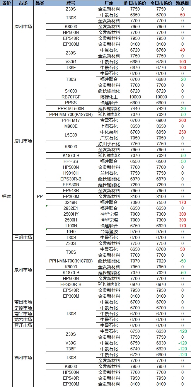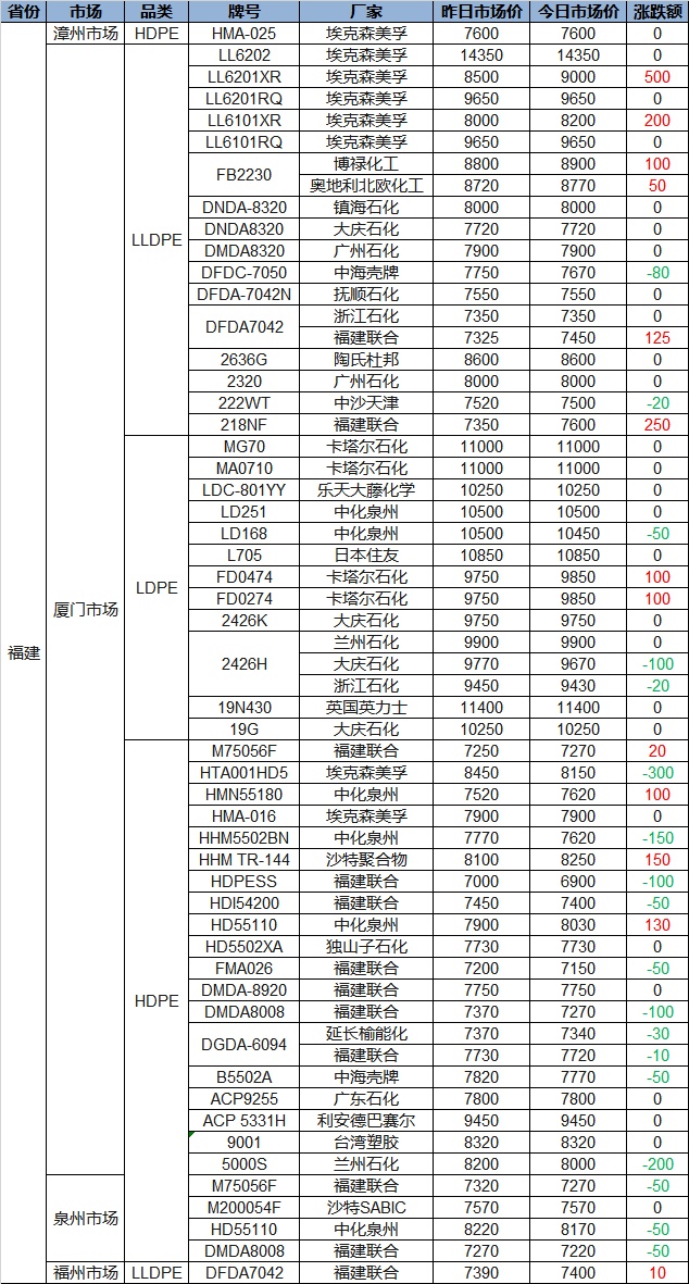 [Today's PP and PE Prices in Fujian] Mixed Changes! PP Down by Up to 120, PE Up by Up to 500