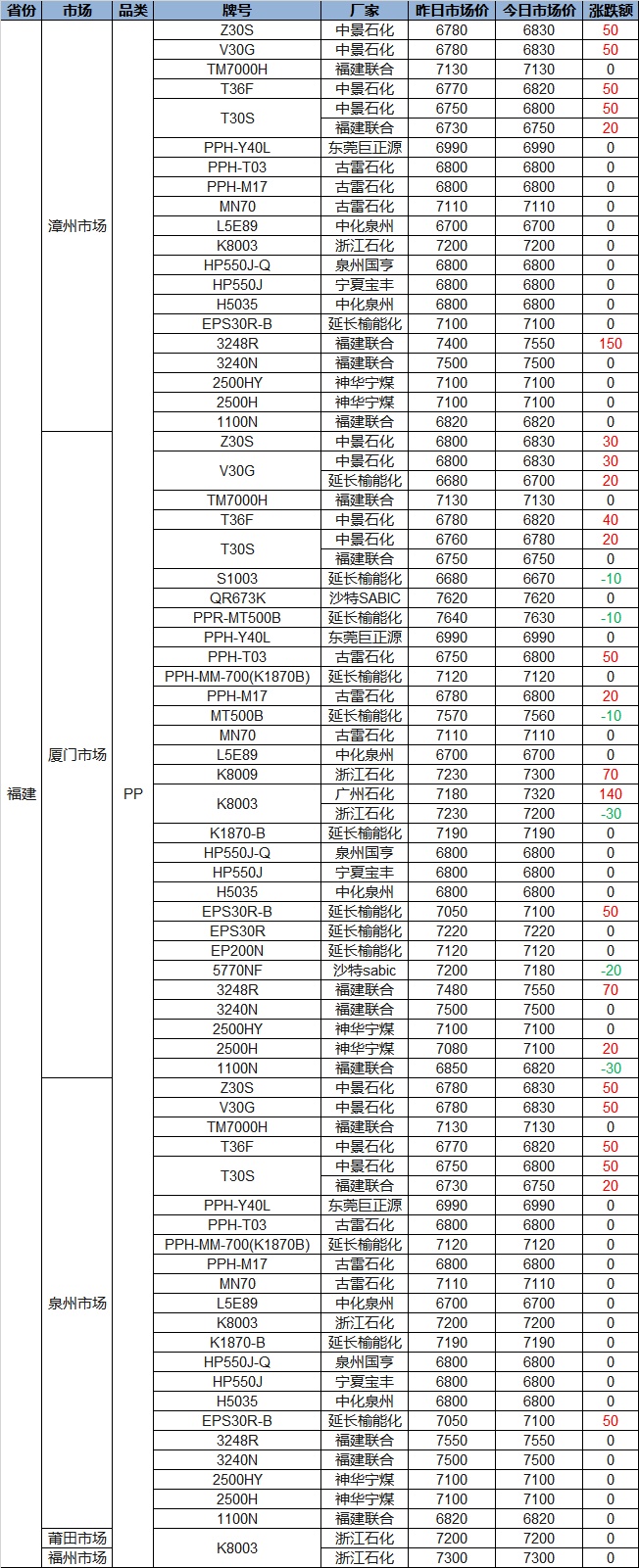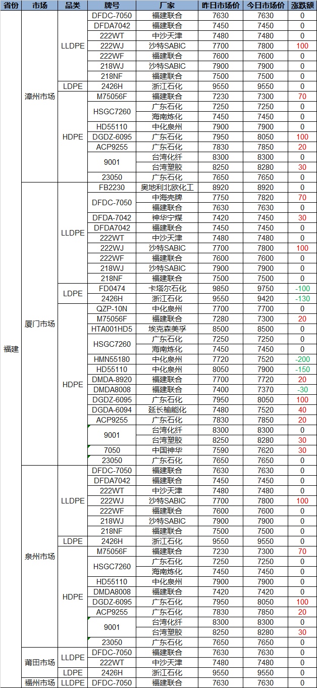 [Today's PP, PE Fujian Plastic Prices] Mostly Rise, PP Up to 150, PE Down Up to 200