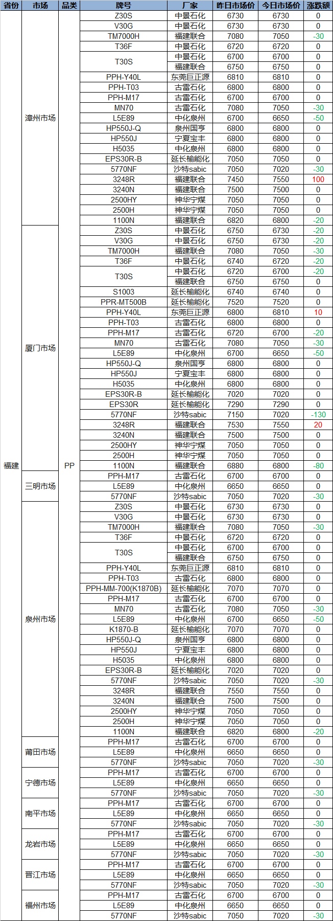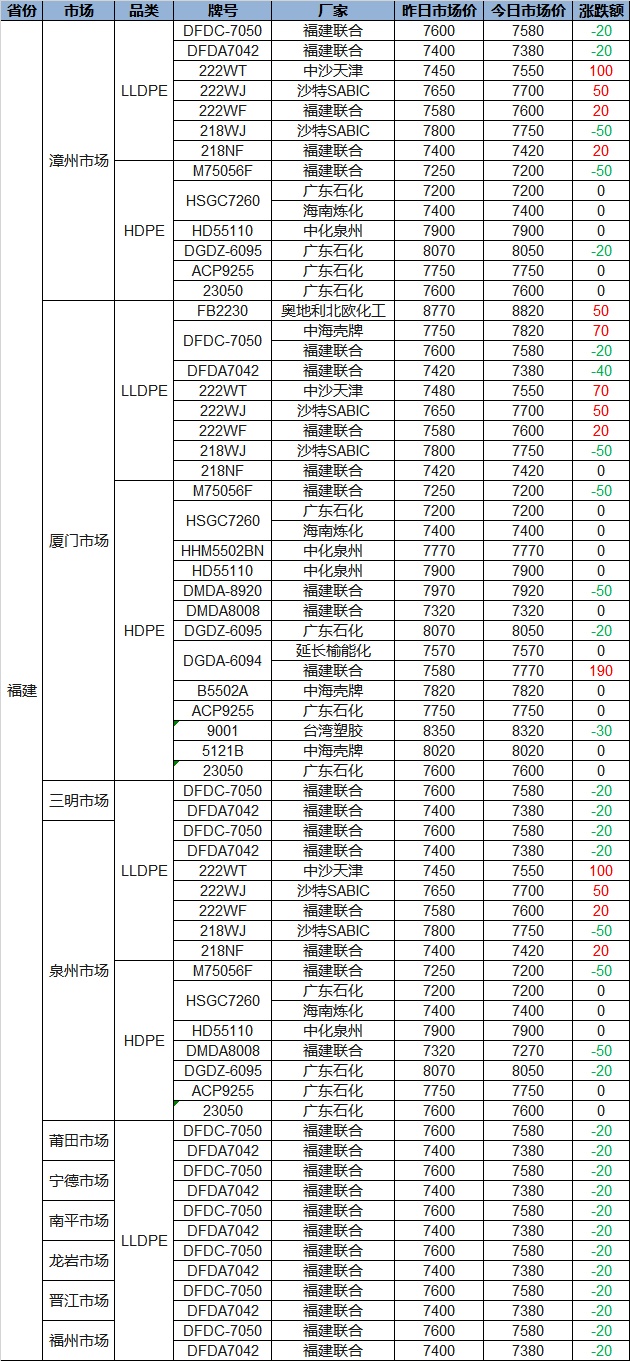 [Today's PP, PE Fujian Plastic Prices] PE Drops More Than Rises, Some Drop by 20-50! PP Drops by Up to 130