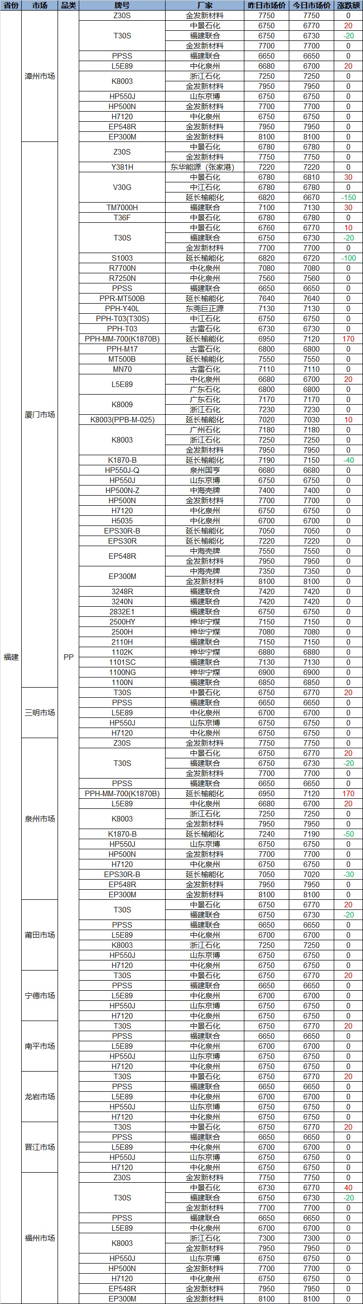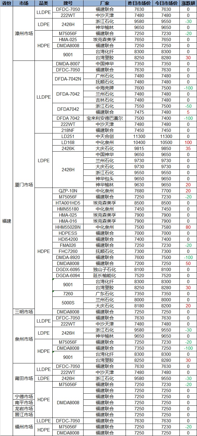 [Today's PP, PE Fujian Plastic Prices] PE Rises and Falls, Mostly Up or Down by 20-100! PP Drops Up to 150