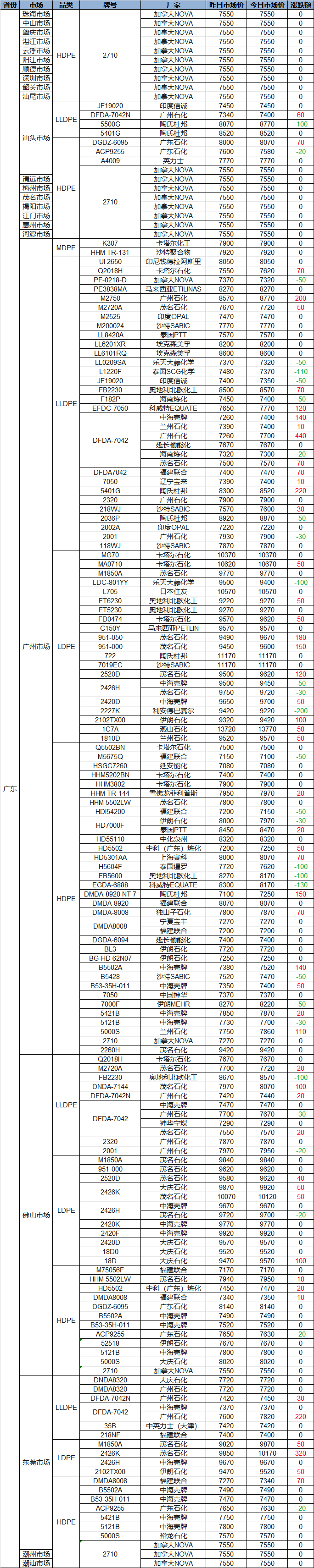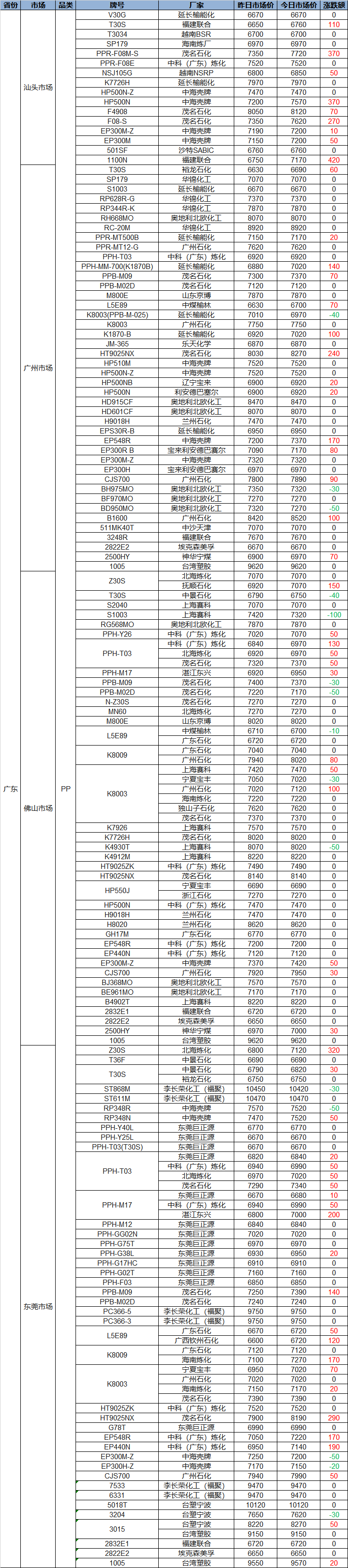 Summary: On October 28th, the Guangdong polyolefin market saw new prices in the morning! Most PP prices rose, with some increasing by 10-270, the highest rise being 420; some decreased by 20-100. PE prices showed mixed trends, with some rising or falling by 10-200, the highest rise being 440 and the highest drop being 200.