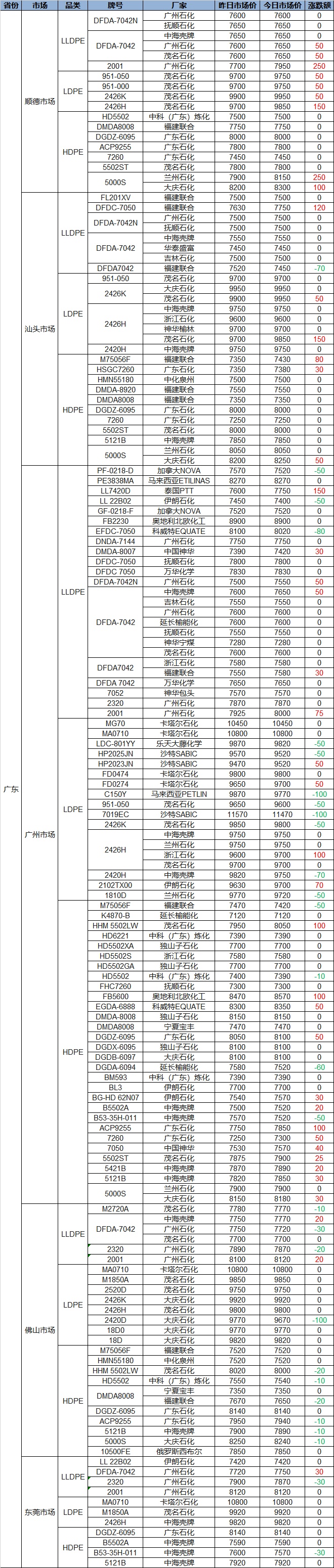 [Today's PP, PE Guangdong Plastic Prices] PP Up by Maximum 485, PE Up by Maximum 250! Shunde Market Generally Rises