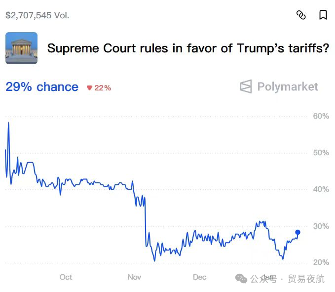 Currently, the betting odds on Polymarket for the question "Will the Supreme Court rule in favor of Trump's tariffs?" indicate a 29% probability for "Trump winning."