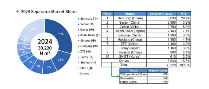 Among them, China's Enjie, Xingyuan Materials, and Jinneng New Energy collectively hold over 90% of the market share, with their overall shipments accounting for more than 80% of the global total. In contrast, Korean and Japanese diaphragm manufacturers are generally facing growth bottlenecks in 2024. Due to weak demand in the European market and customer inventory adjustments, major companies such as Asahi Kasei, SKIET, and WCP have experienced stagnation in shipment growth, leading to a gradual decline in market share.