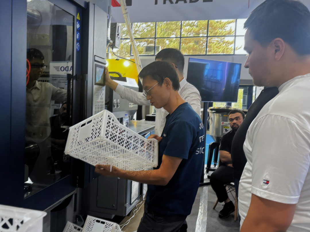 The atmosphere at this exhibition is lively. Many local plastic manufacturers have pointed out that their existing equipment is severely outdated and urgently need to introduce a new generation of efficient and energy-saving injection molding equipment. Tederic precisely aligns with the needs of Central Asian customers, focusing on the daily consumer goods market in Central Asia,DT500The elbow rod injection molding machine debuted, bringing application solutions for fruit crate production, and comprehensively showcased continuous breakthroughs in injection molding technology and green manufacturing. A large group of customers from Central Asia and the Middle East gathered in front of the Tairui booth, expressing interest inDT500The injection molding machine shows strong interest.