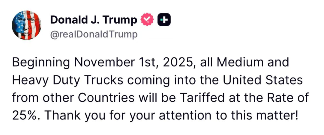 On October 7, 2025, U.S. President Trump officially announced on the Truth Social platform that, starting from November 1, 2025, the United States will impose a 25% tariff on all imported medium- and heavy-duty trucks.