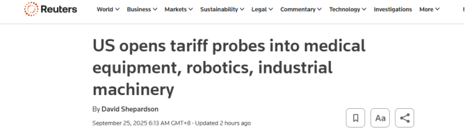 On September 24, the Trump administration announced that it has launched an investigation into imports in key areas such as medical devices, robotics, and industrial machinery. This move is seen as an important step by Donald Trump to further expand the tariff system and lay the groundwork for new tariffs.