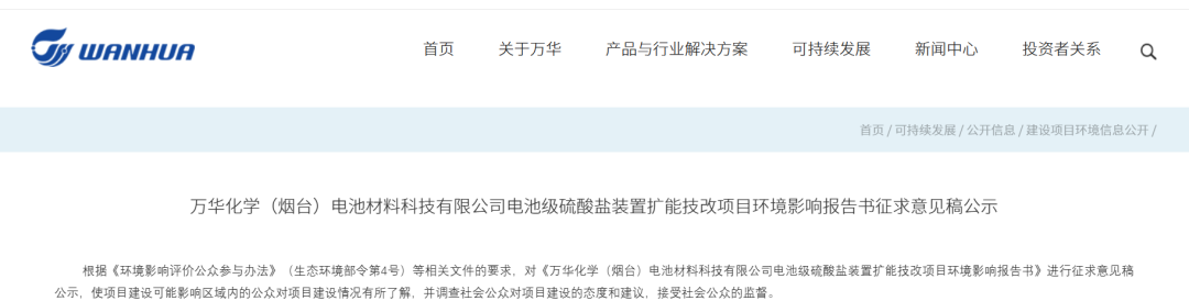On September 23, Wanhua Chemical (Yantai) Battery Materials Technology Co., Ltd. announced the expansion and renovation project of its battery-grade sulfate facility.