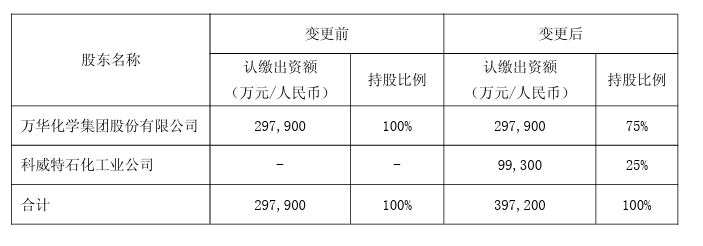 In March this year, the capital increase and share expansion project of Wanhua (Yantai) Petrochemical was listed on the Shandong Property Rights Exchange Center. On April 25, Wanhua Chemical and Kuwait Petrochemical officially signed a joint venture agreement. Prior to this, Kuwait Petrochemical had completed the delisting procedure at the Shandong Property Rights Exchange Center.