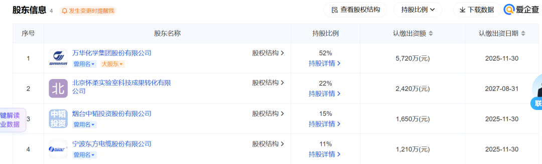 Recently, Yantai Wanhua Electric New Materials Co., Ltd. was established. The company is jointly held by Wanhua Chemical, Beijing Huairou Laboratory Technology Achievement Transformation Co., Ltd., Yantai Zhongtao Investment Co., Ltd., and Orient Cable.The registered capital reaches 110 million yuan, and the business scope includes new material technology promotion services, synthetic material manufacturing (excluding hazardous chemicals), etc.